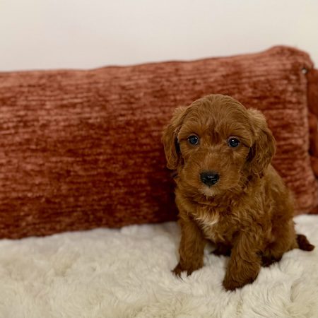 Check out this super cute super tiny, Toy Sized Goldendoodle Puppy Teddy! Teddy is a red toy GoldenDoodle Puppy. He is hypo-allergenic, wavy coat, red with NO-shedding and a gorgeous light curly coat! Teddy is well started on his house breaking and so playful yet calm!